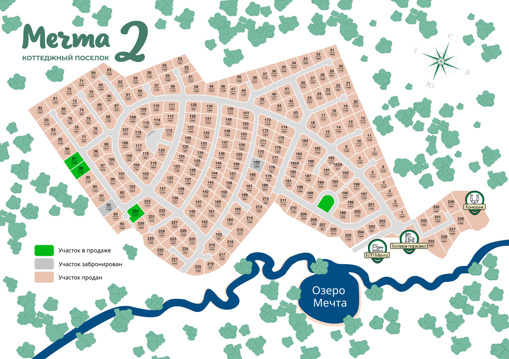 В Мечте-2 расположилось 230 участков площадью от 7 до 16 соток, без обязательного подряда и регламента застройки. К каждому участку есть возможность подвести все необходимые коммуникации: электричество, магистральный газ, дороги. К каждому участку подключено электричество 15 кВт, сделаны дороги из асфальтовой крошки